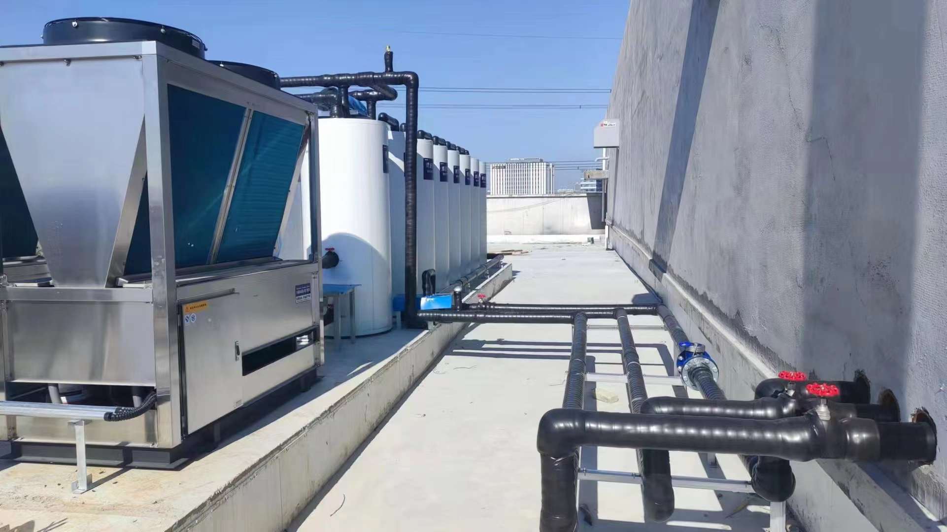 ??全天候供水的安裝方法有直熱式、循環式、大小水箱等模式。直熱式是指冷水經過主機加熱后的熱水直接就可以使用,此原理通過一個節流裝置來控制補水量的大小,水流量不能充滿整個換熱器,因此考慮到換熱器的管徑不能太大,要經過反復調試選取最合理的管徑與走水方式。